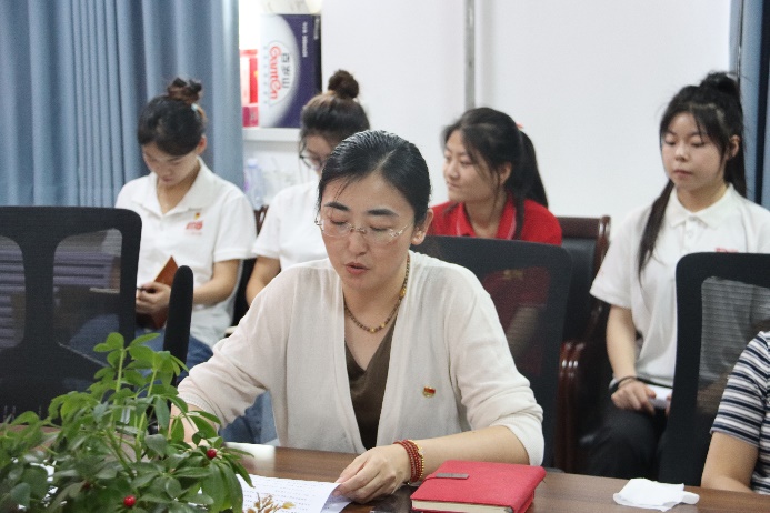 会议第四项,新发展员工党员代表胡芮琼同学发言。她说共产党员这个新的身份带来的是责任和担当,她将持之以恒地学习党的理论知识,虚心向优秀党员同志学习,汲取他们的优点和经验,不断提升自己的能力水平,拓宽自己的知识视野,提高自己的综合素质,用实际行动践行入党誓言,展现新时代党员的担当和风采。