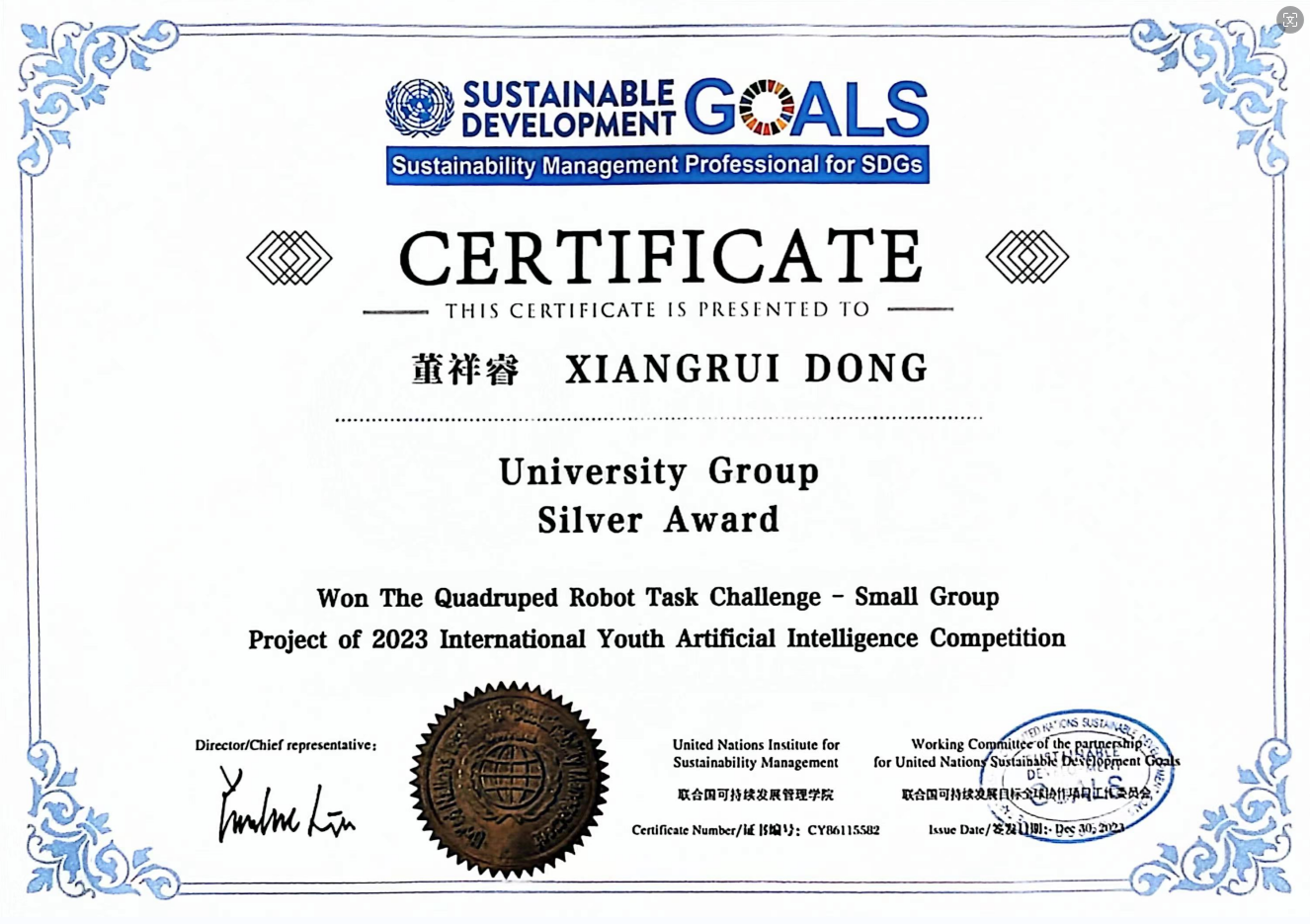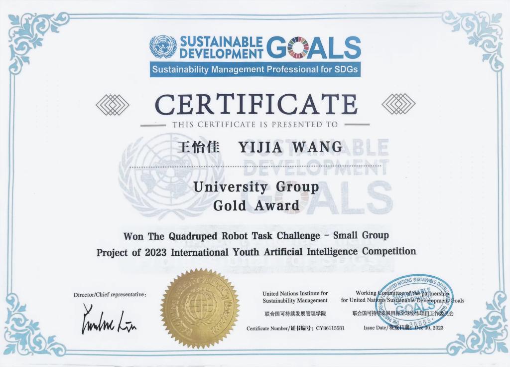 近日,由中国人工智能学会主办的第五届国际青年人工智能大赛国际证书发放,公司王怡佳同学获得金奖证书,董祥睿同学获得银奖证书。公司五支队伍的提交的作品在全国总决赛中分别获得一等奖1项,二等奖2项,三等奖2项。