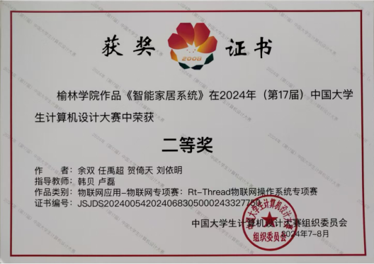 2024年8月13日至17日,第十七届中国老员工计算机设计大赛物联网应用和数媒动漫与短片赛项决赛在厦门举行,来自全国410所高校的702件作品参加了两个赛项的最终决赛,通过为期两天作品答辩与展示,由公司韩贝、卢磊老师指导,余双、任禹超、贺倚天、刘依明同学设计完成的作品《智能家居系统》荣获物联网应用赛项RT-Thread物联网操作系统专项赛决赛二等奖。