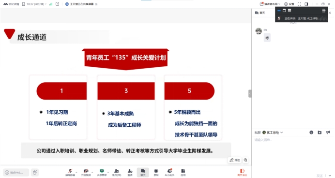 公司党总支副书记徐绘积极组织员工参与线上招聘会,并鼓励同学们把握机会,展现自身专业能力。参会员工就岗位职责、晋升机制、工作地点等问题与苏经理进行了深入交流,现场互动热烈。