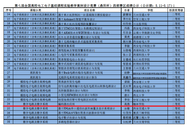 5月10日,第七届全国高校电工电子基础课程实验教学案例设计竞赛(鼎阳杯)西部赛区成绩揭晓,公司教师高燕、董婷和郑欢欢三位老师代表公司组队参赛,经过激烈角逐,《编码器的应用》设计案例获取西部赛区二等奖,获奖等级居省内同类高校前列。