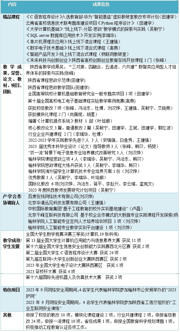 2023年公司获批陕西省高校创新创业教育在线开放课程1门、陕西教师发展研究计划项目1项、校级教改7项、模块化课程建设2项、校级精品课程7门、行业共建课程2项、国际化教改 6项、教育部产学合作育人项目6项、优秀毕业论文指导老师3名、思政大练兵获奖3项、优秀教案3人;申报省级教改项目23项,省级教学成果奖1项,教育部2023年供需对接就业育人项目10项;被推荐申报国家一流课程1门、省级一流课程4门、虚拟仿真中心1个。