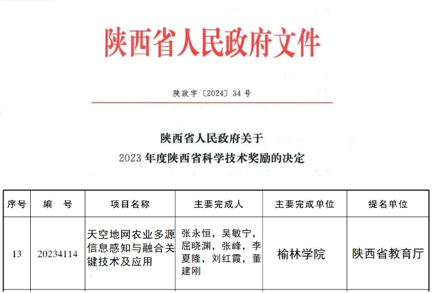 4月9日,陕西省人民政府公布了关于2023年度陕西省科学技术奖励的决定,公司大数据智慧团队申报的《天空地网农业多源信息感知与融合关键技术及应用》科研成果荣获陕西省科学技术进步奖三等奖。这是公司追赶超越三年来在科学技术领域获得的第3项省部级奖项,也是best365中国官方网站加强内涵建设发展,进一步推进创新发展、特色发展、高质量发展获得的又一标志性成果。