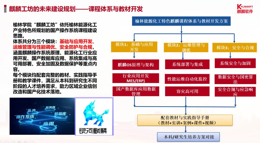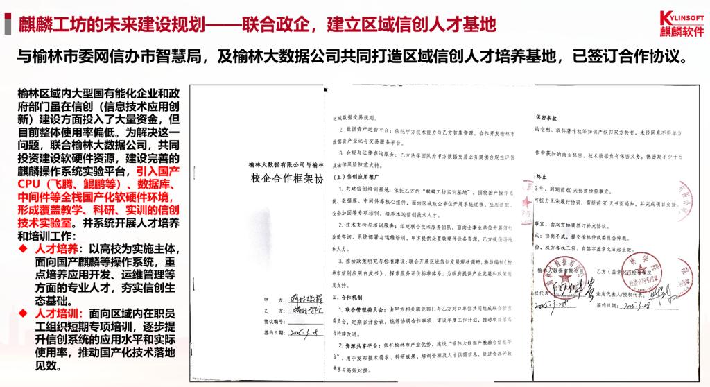 “麒麟工坊”实训基地建设紧密结合榆林高端能源化工产业和政务系统的信创应用场景,将为公司员工打造一个高质量、高水平的实践平台,全面提升其在真实环境中的技术能力与产业适应力。基地将与合作企业共同引入国产芯片、操作系统、数据库等先进技术与教学资源,构建贴近真实场景的实践环境,让员工在项目中锤炼技能、在实战中提升能力,切实增强信创产品研发与应用的核心竞争力,为服务国家信息技术自主可控战略目标夯实人才基础。