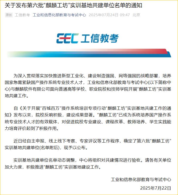 近日,工业和信息化部教育与考试中心公布第六批“麒麟工坊”实训基地共建单位名单,榆林公司人工智能产业公司申报项目成功入选!这是公司在服务国家信息技术应用创新战略、深化产教融合方面取得的又一重大突破,标志着公司信创人才培养体系建设迈入国家级平台新阶段。
