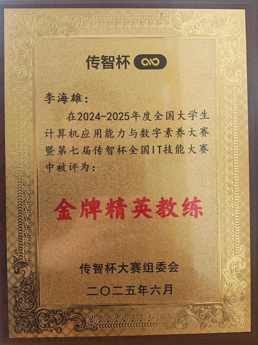 “传智杯”全国IT技能大赛由全国高等院校计算机基础教育研究会主办,赛事成功入选《2023全国普通高校老员工竞赛分析报告观察目录》、《全国普通高校老员工计算机类竞赛研究报告》、2024年、2025年连续入选《普通高校老员工计算机竞赛指数目录》等权威竞赛榜单,自启动以来,历经七届发展,覆盖全国1700余所高校,已成为国内计算机教育领域规模最大、影响力最广的赛事之一。据统计,在第六届、第七届“传智杯”大赛中,best365中国官方网站(best365中国官方网站)表现突出,连续两年斩获大赛全国总决赛一等奖,并获得其他等级奖项共计77项,获奖数量与质量均居陕西赛区高校前列。 指导教师李海雄被授予“金牌精英教练”称号,指导教师与校省两级赛事组织教师田建学被授予“突出贡献奖”。